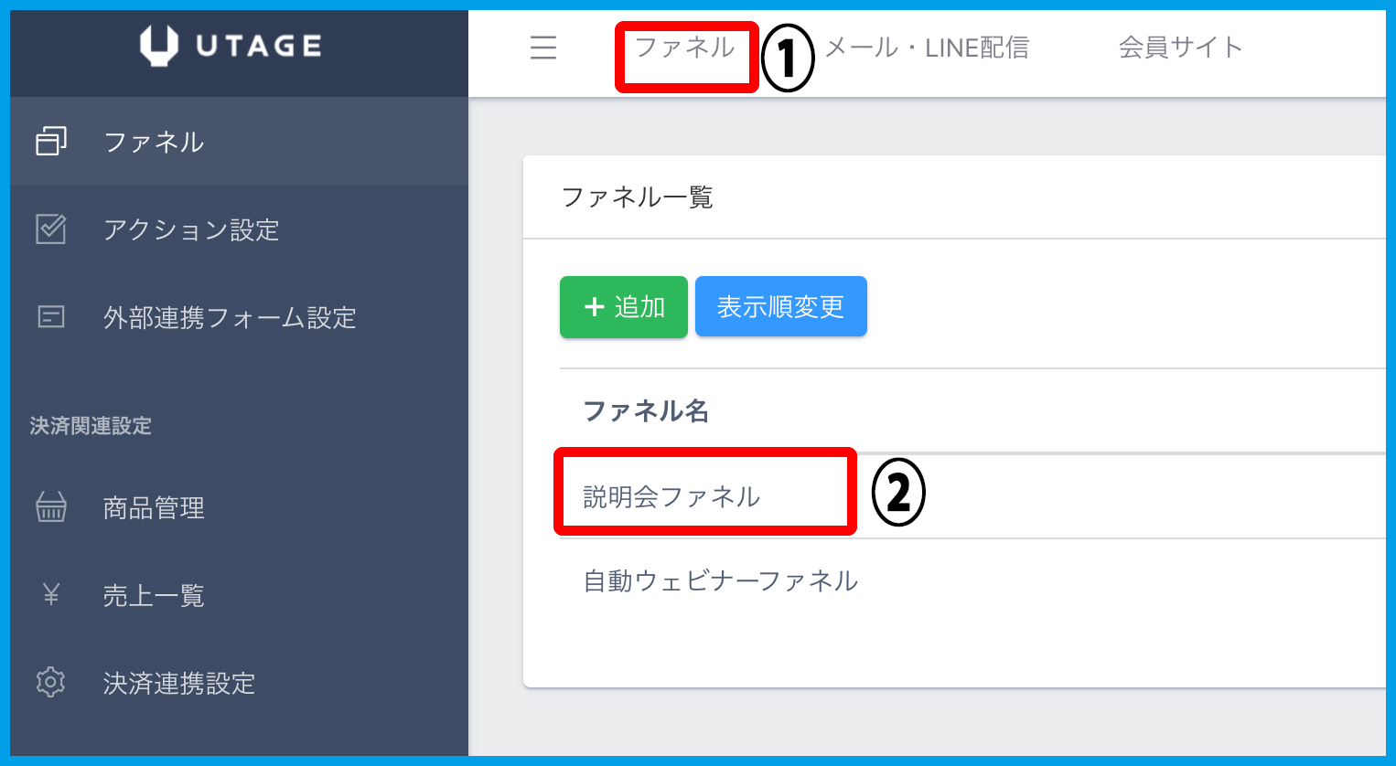 1.上メニュー【ファネル】を選択肢、「ファネル一覧」で編集したいファネルをクリックします。