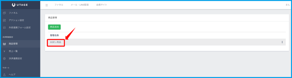 1.上メニュー【ファネル】>左メニュー【商品管理】をクリックします。