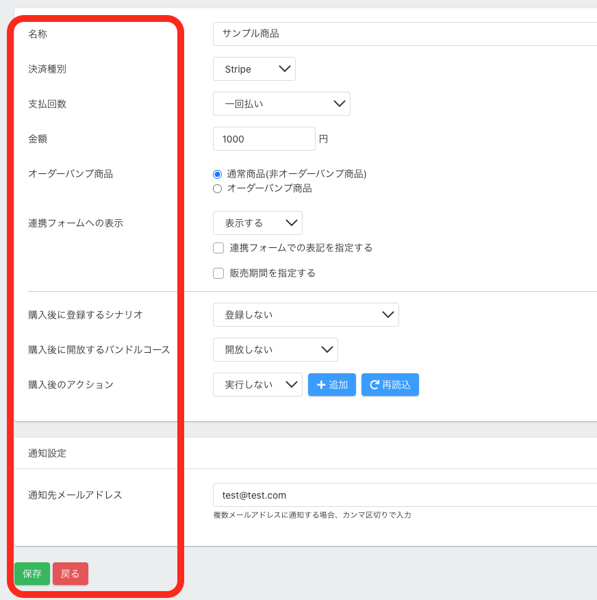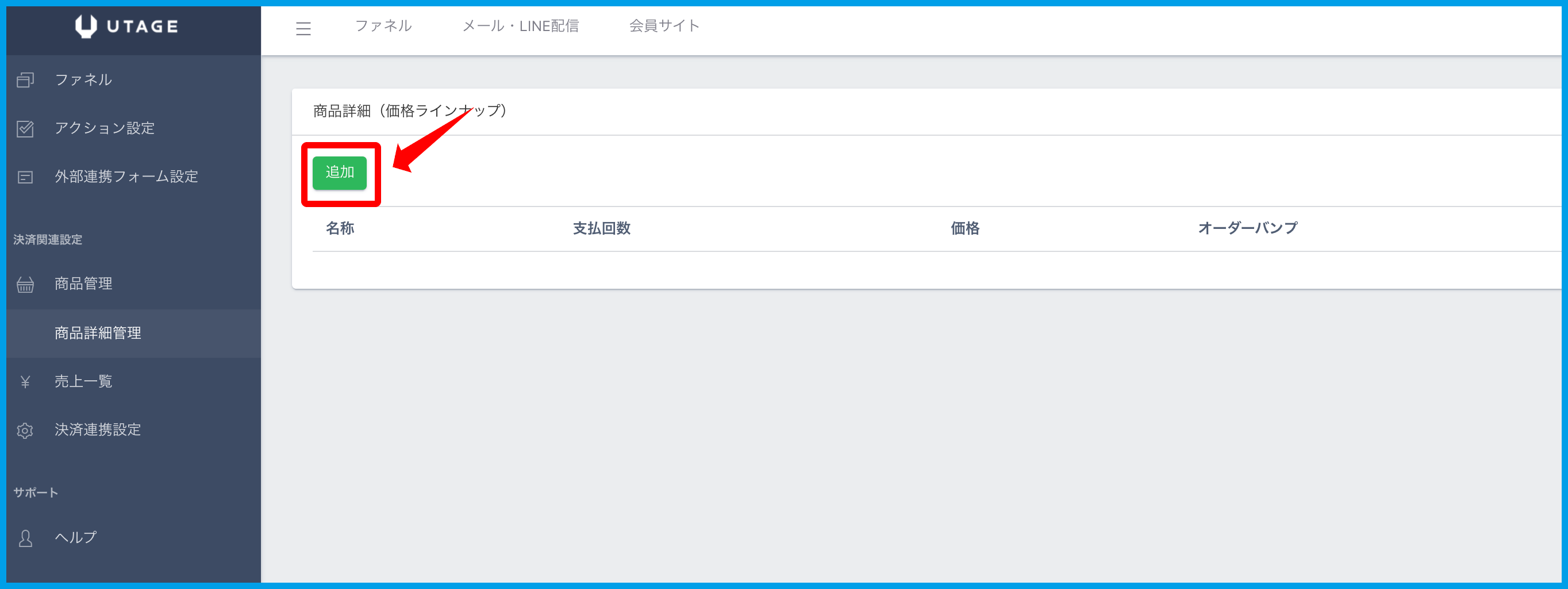 【ファネル】機能のページにて商品販売をする場合には設定が必要です。