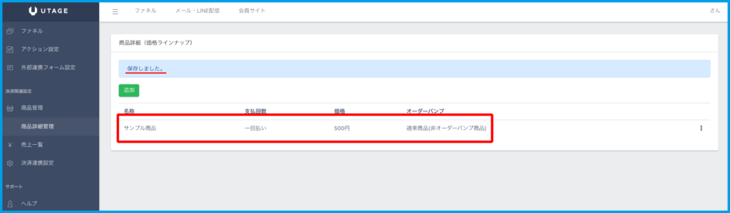 また、「名称」「決済種別」「支払回数」「金額」「オーダーバンプ商品」といった、どのような決済なのかを設定できるだけでなく