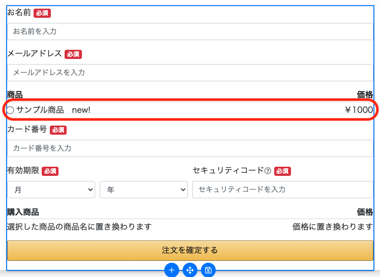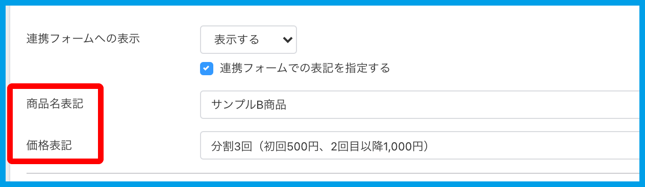 フォームへ表示する際の「商品名」「価格表記」を変更できます。
