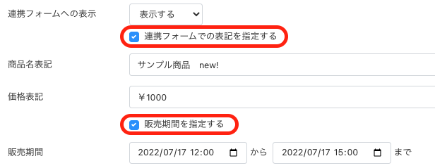 表示オプションから「連携フォームでの表記を指定する」「販売期間を指定する」が設定できます。