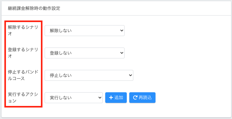・停止するバンドルコース:継続課金によって開放していた会員サイトのバンドルコースがある場合、継続課金解約時に公開を停止するかどうかを選択します