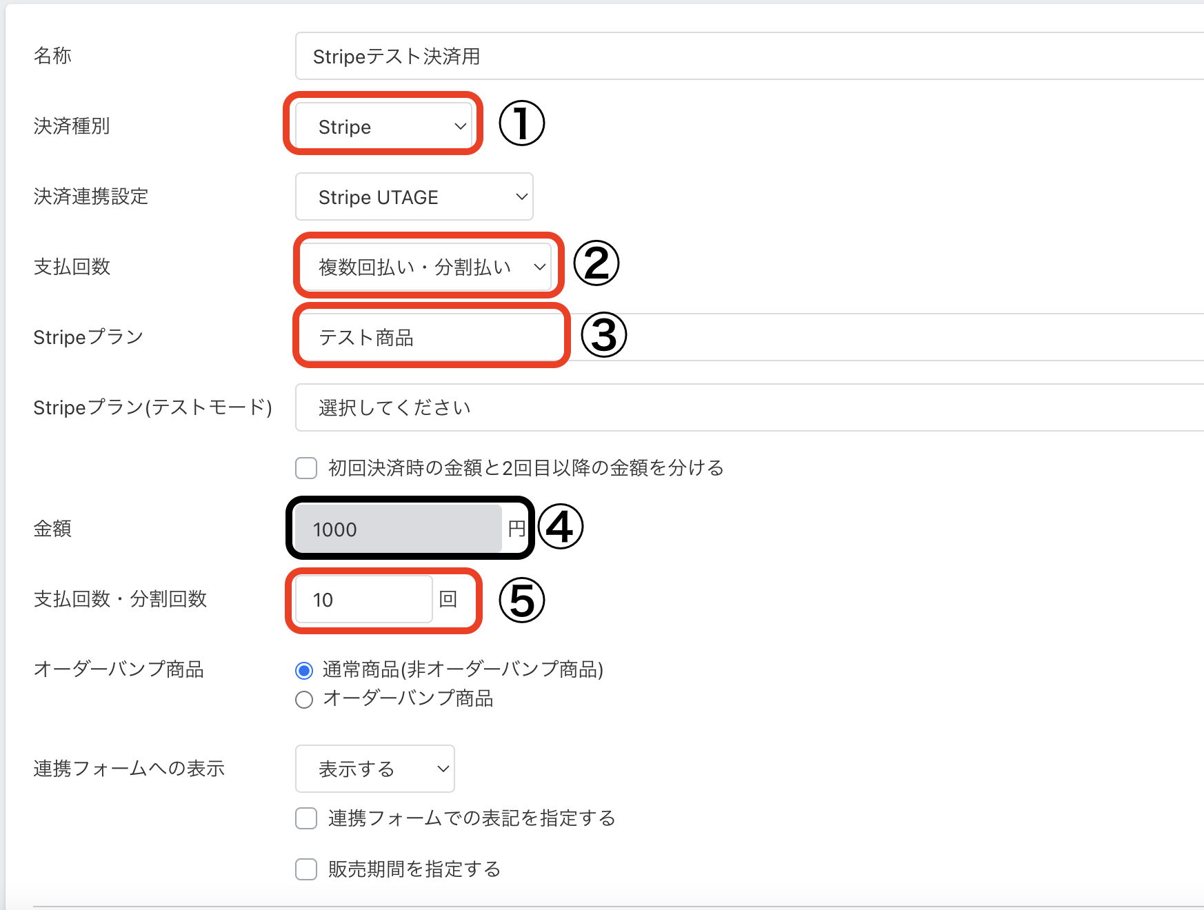 手順3.「決済種別」、「支払回数」、「Stripeプラン」の設定をします。
