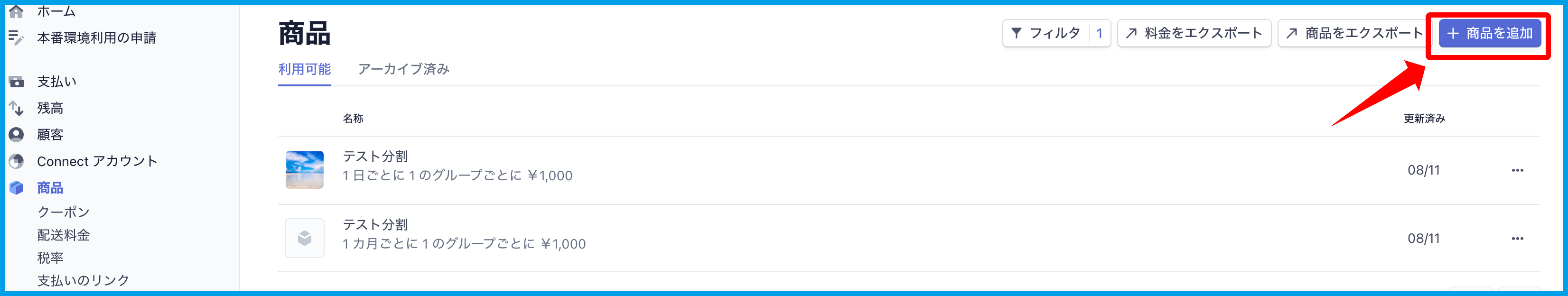手順1.「Stripe」にて「商品」にある【+商品の追加】をクリックします。