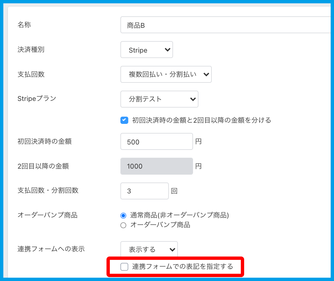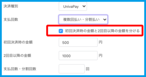 ※支払回数設定後に表示される【初回決済時の金額と2回目以降の金額を分ける】にはチェックを入れます。
