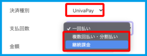 1.【決済種別】に「UnivaPay」を選択し、【支払回数】を「複数回払い・分割払い」または「継続課金」にします。