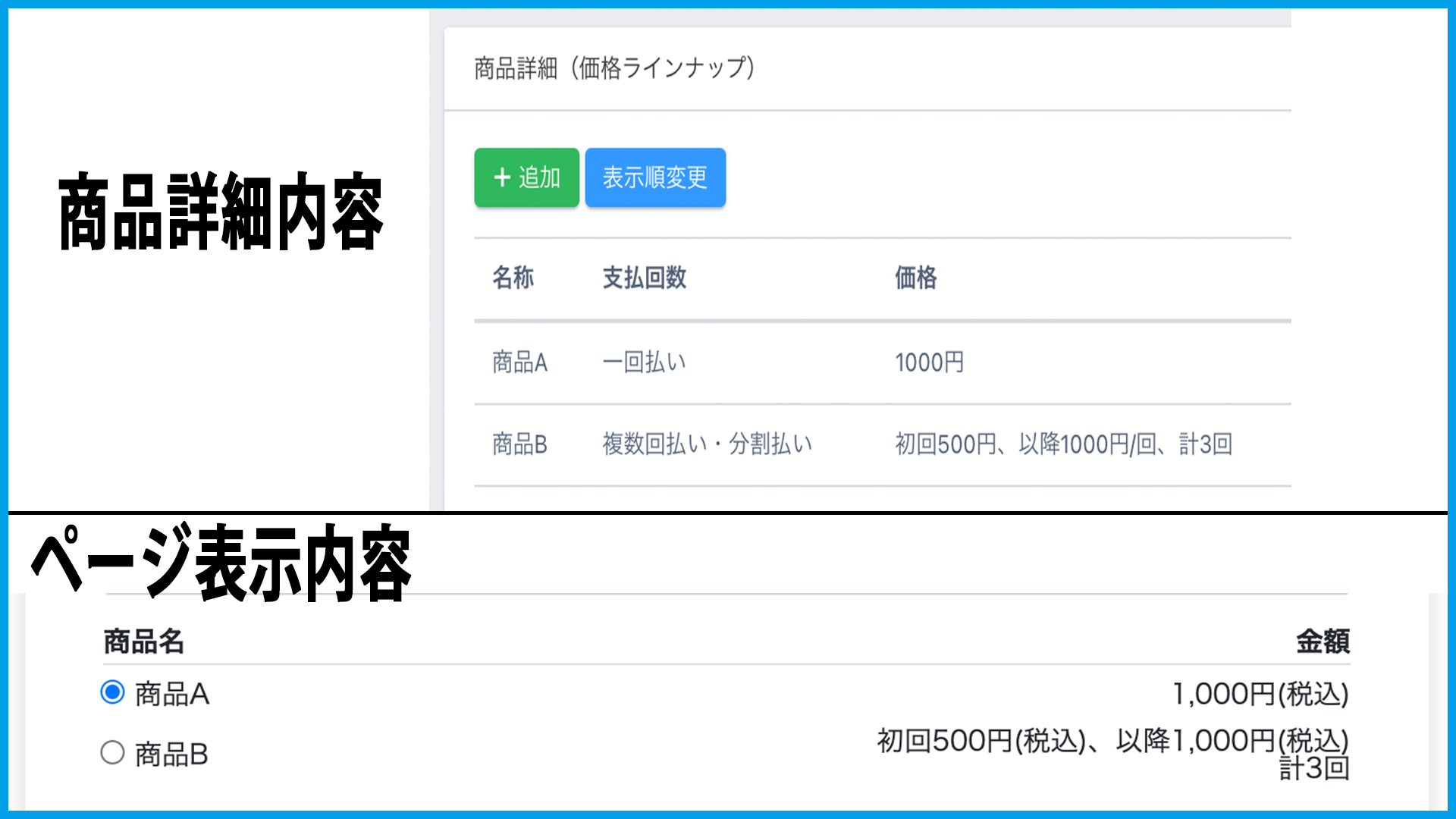 1つの商品に対して、一括払い、分割払いと複数の支払い方法を登録することができます。