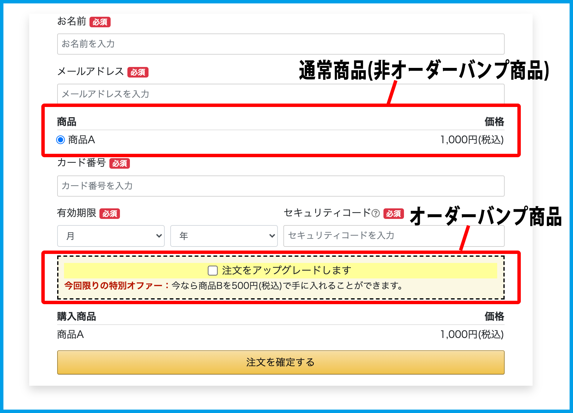 ・オーダーバンプ:メインの商品とはまた別の商品をセットで販売することができます。以下のスクリーンショットの下赤枠部分。