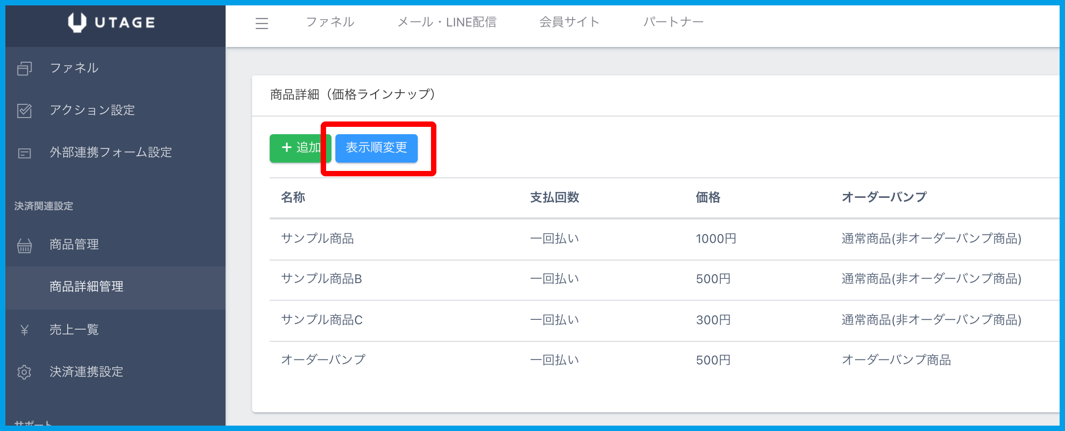 ※表示順の変更は「通常商品(非オーダーバンプ商品)」のみ可能です。