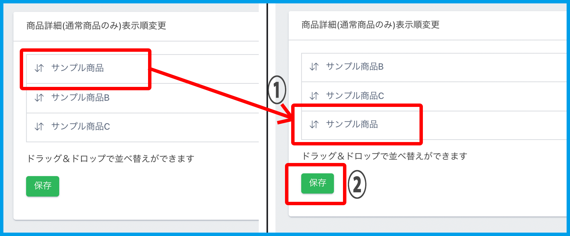 2.「商品詳細(通常商品のみ)表示順変更」ページになったら、ドラッグ&ドロップで並べ替えて【保存】をクリックします。