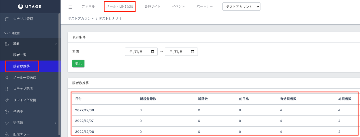 「新規登録数」「解除数」「前日比」「有効読者数」「総読者数」が確認できます。