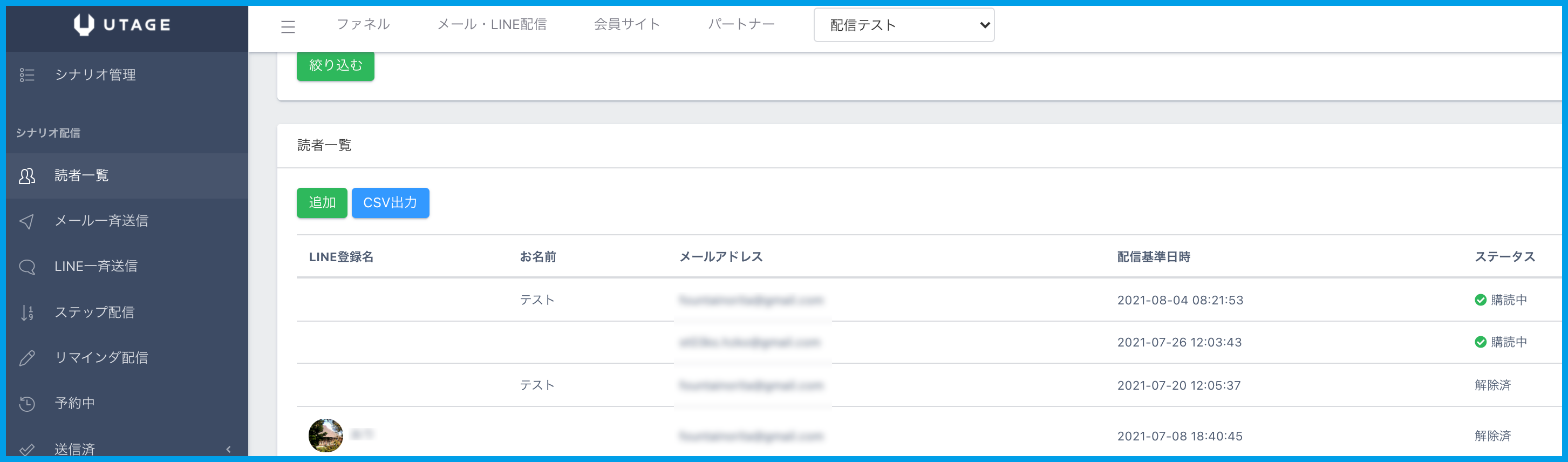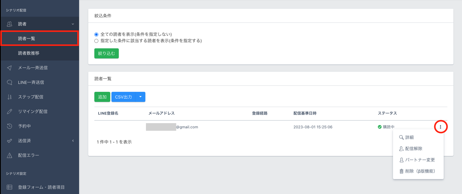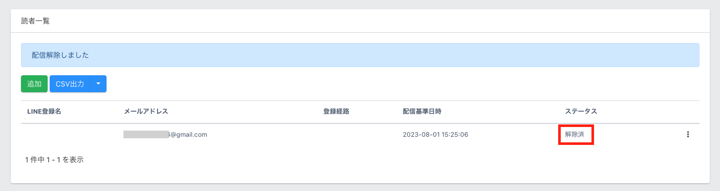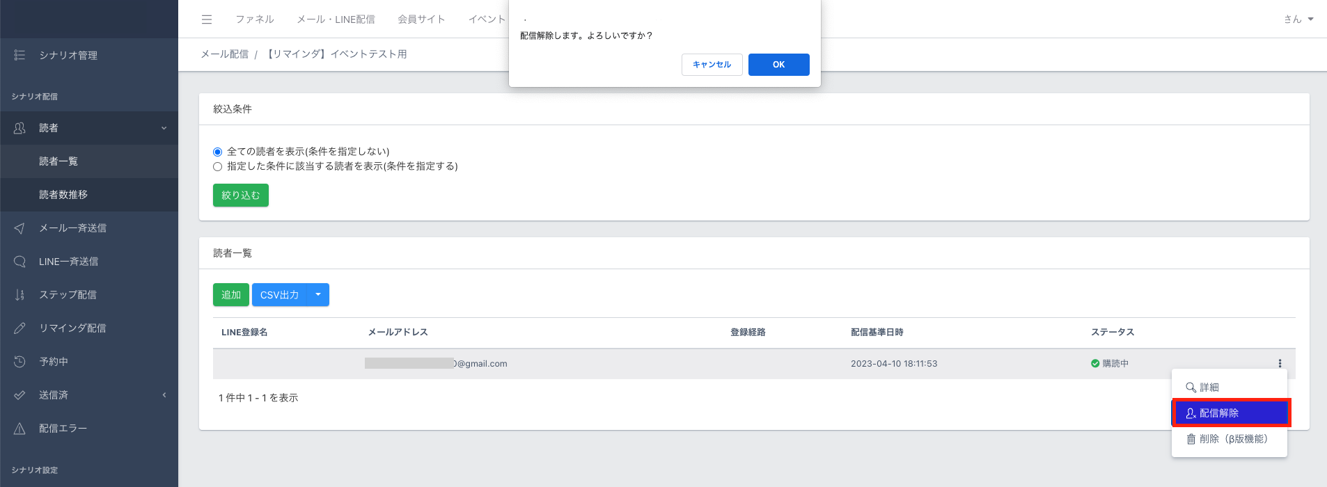 読者を削除してしまうと問い合わせ時に対応できませんので、テストデータ以外の削除はせず『配信解除』にてご対応ください。