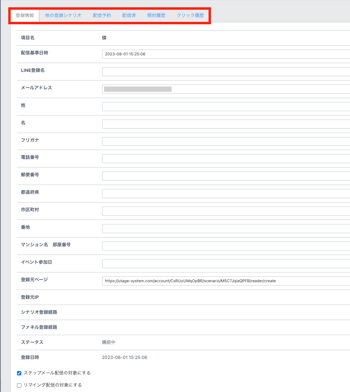 『登録情報』『他の登録シナリオ』『配信予約』『配信済』『開封履歴』『クリック履歴』などの情報を確認できます。