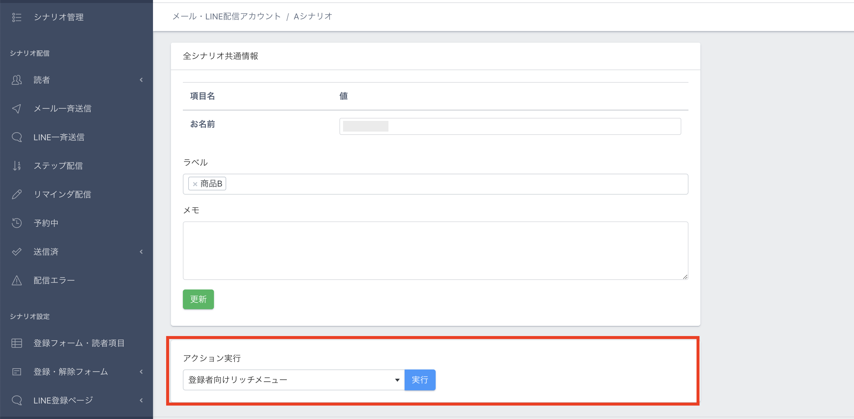 読者詳細の最下部から【アクション実行】することができます。読者に個別でアクション追加する際にご利用ください。