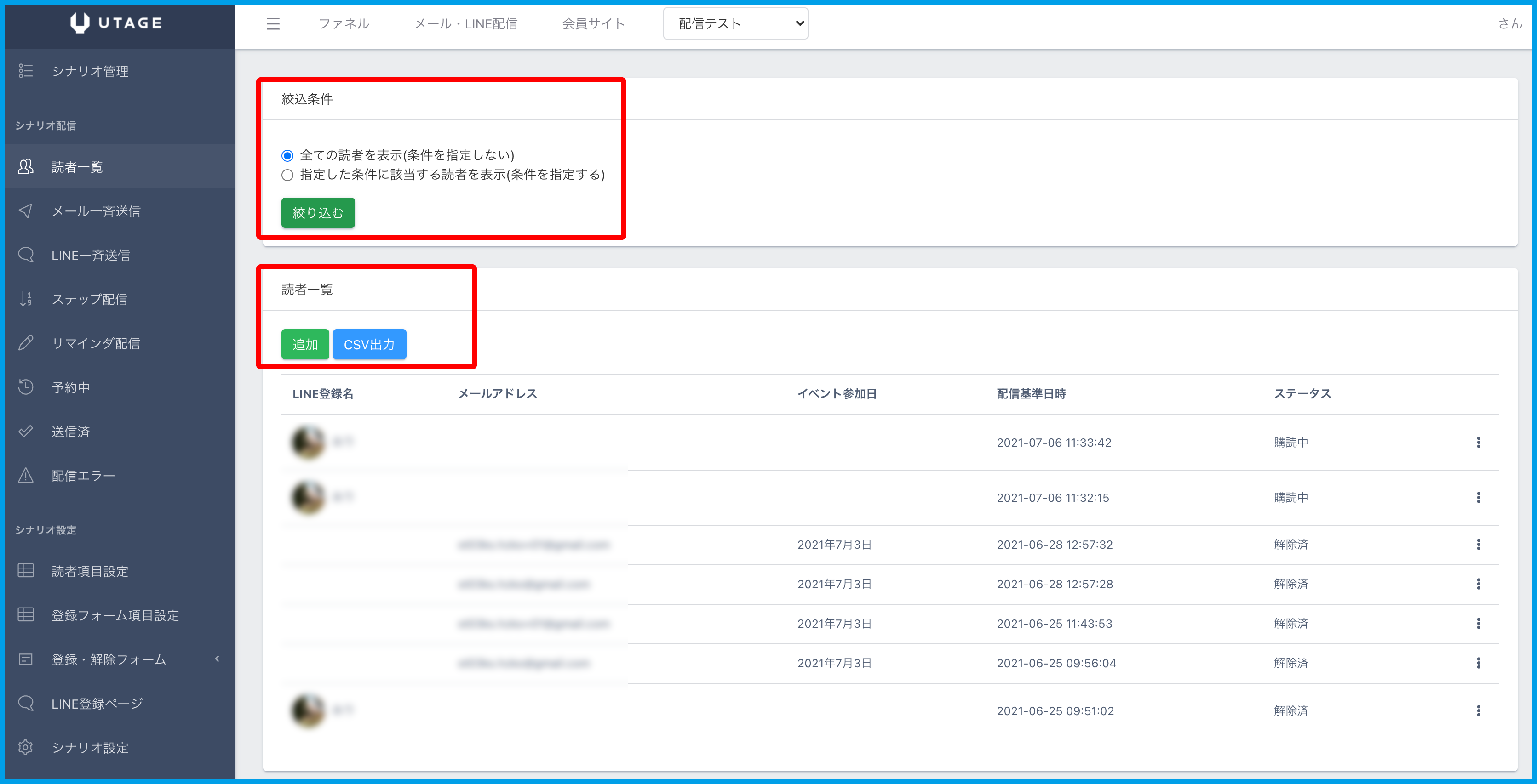 ・読者一覧:読者の表示がされます。一覧ボックスの【CSV出力】にて、CSVデータのダウンロードができます。