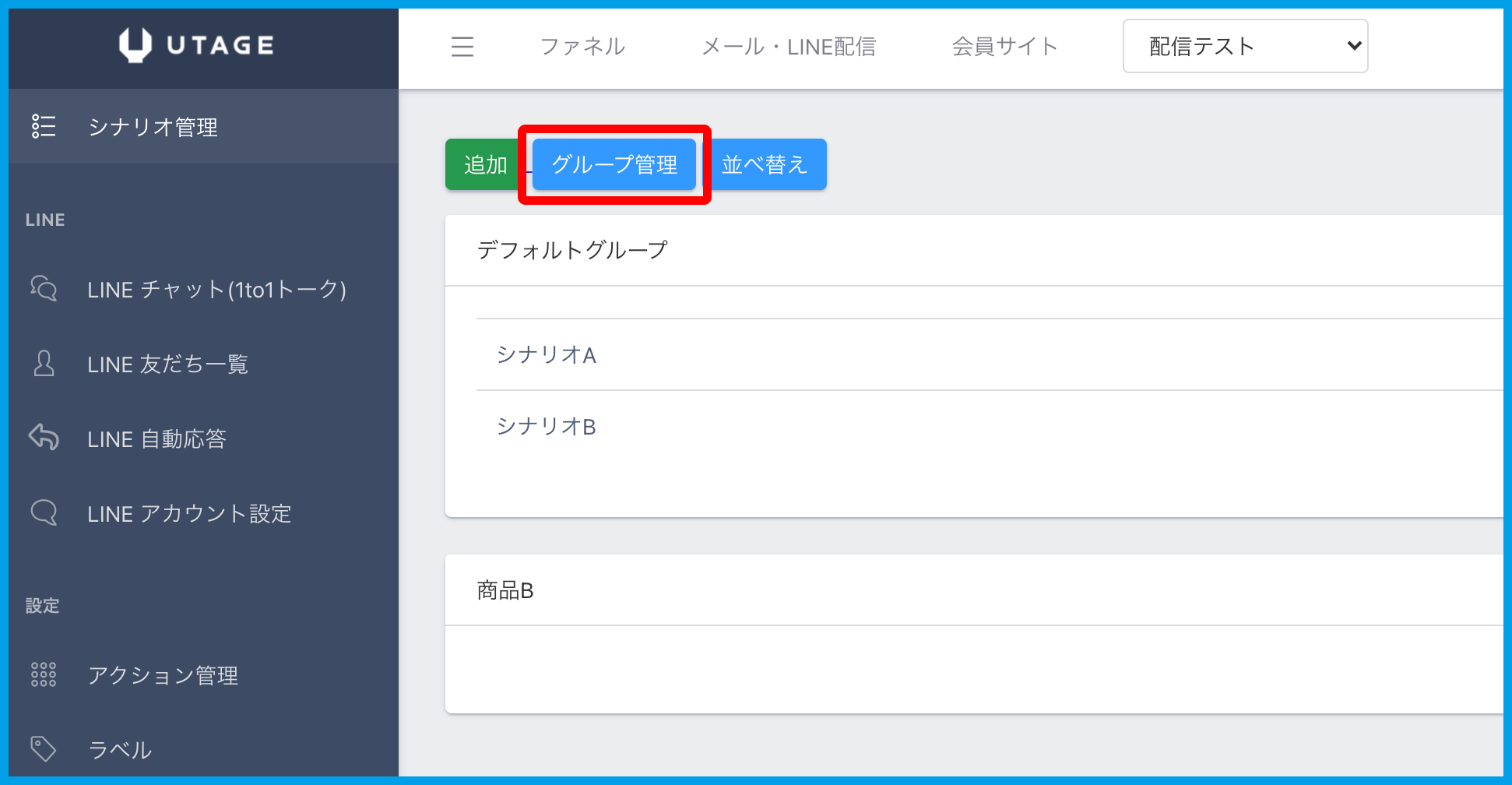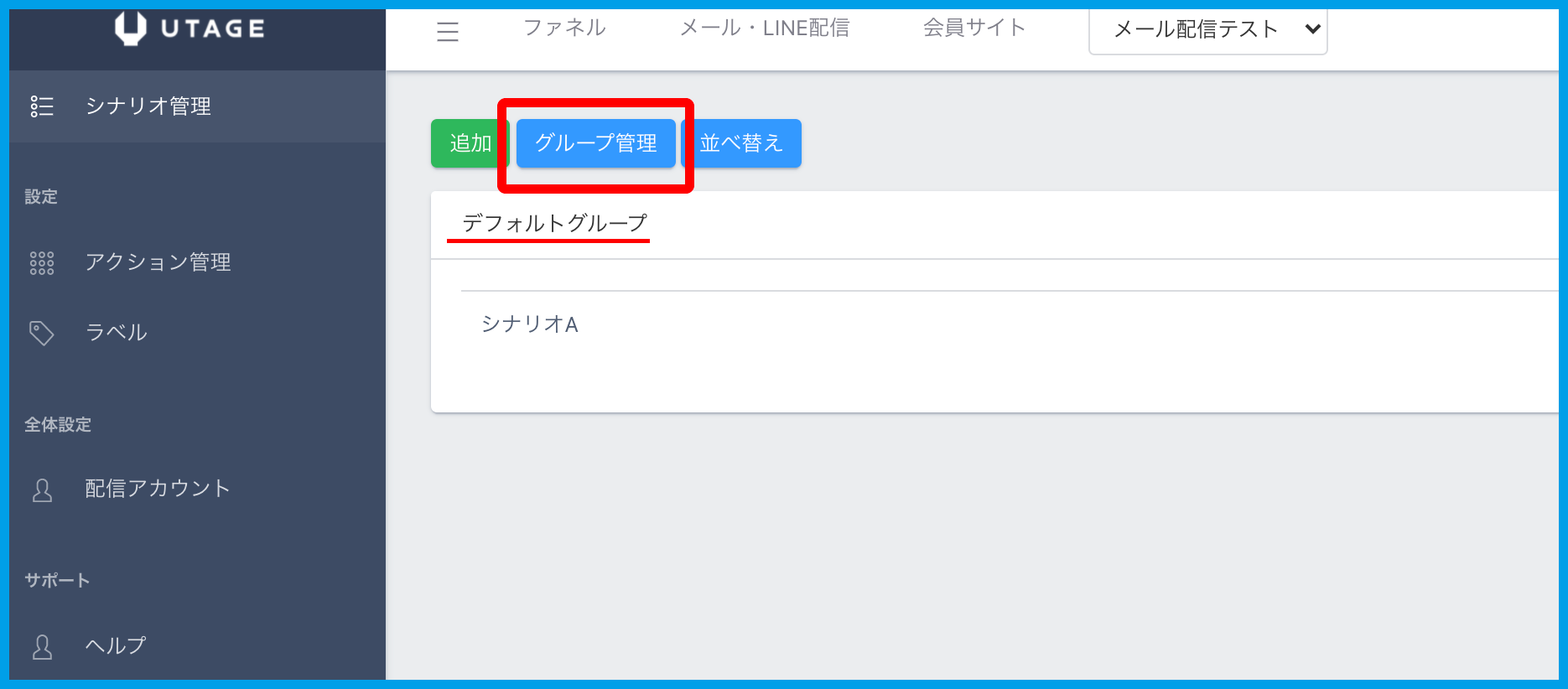 1.追加方法と同じく【シナリオ管理】>【グループ管理】をクリックします。