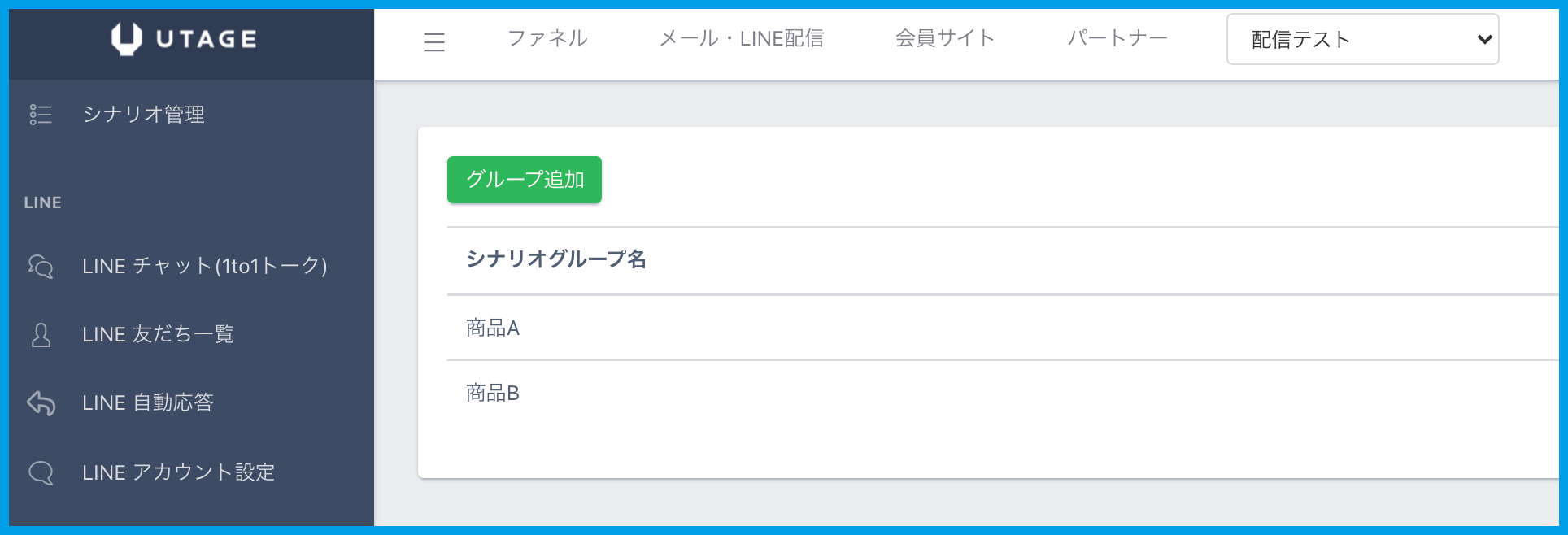 プロジェクトごとにグループを分ける、商品販売とシナリオを連携させている場合に、商品ごとにグループ作成をするなどでご利用頂くと管理がしやすくなりますのでご活用ください。