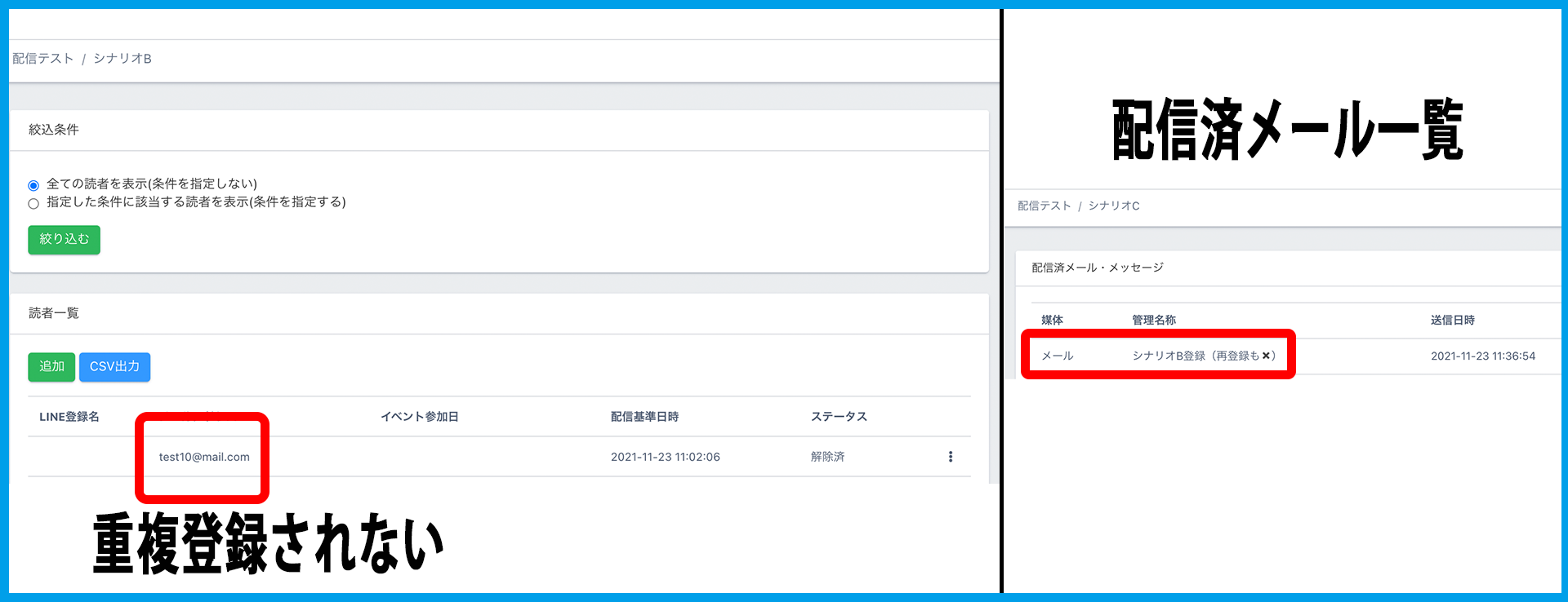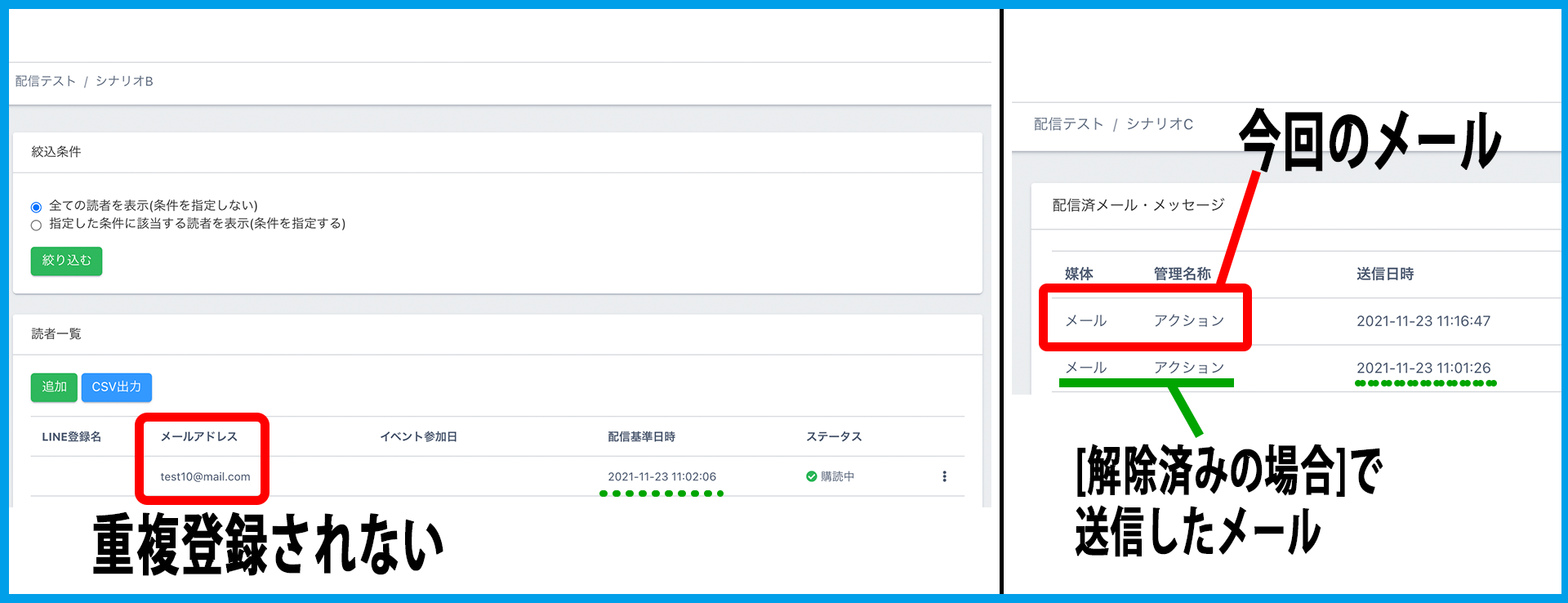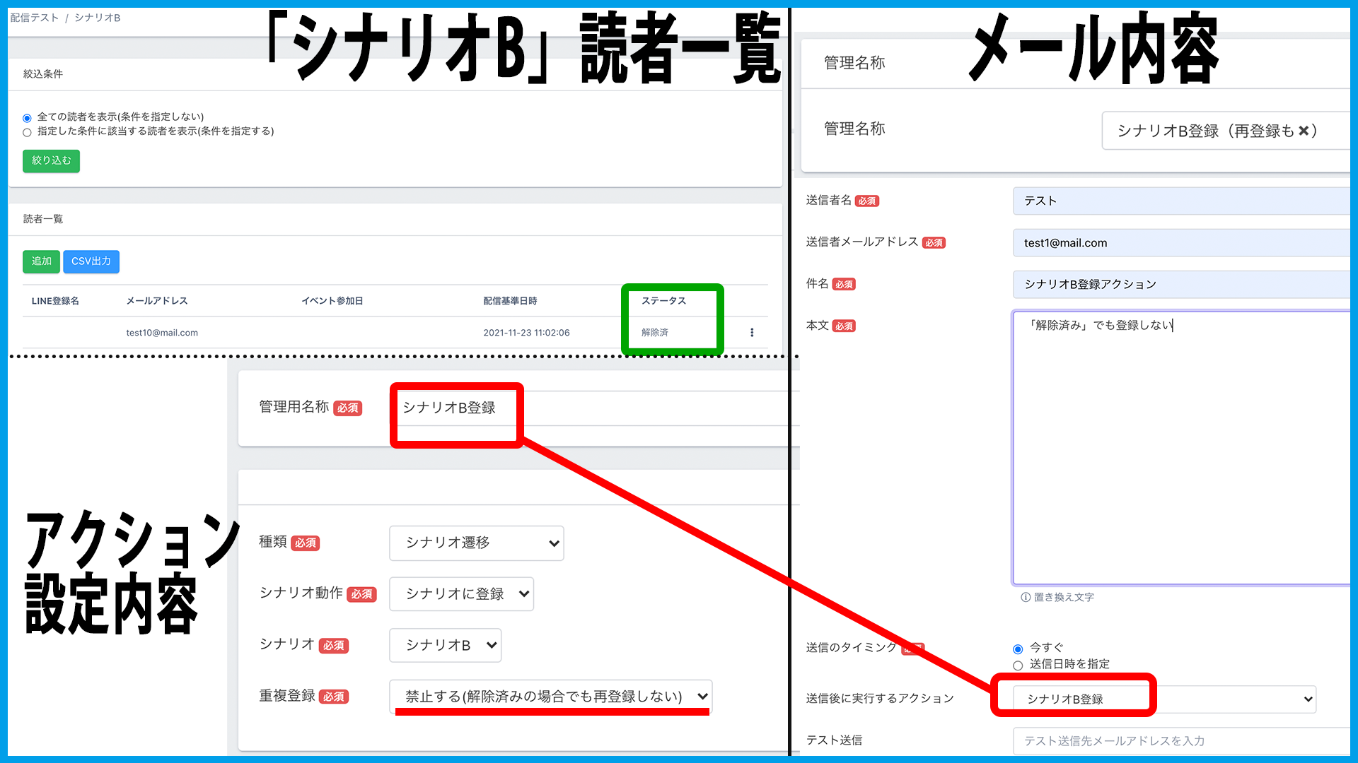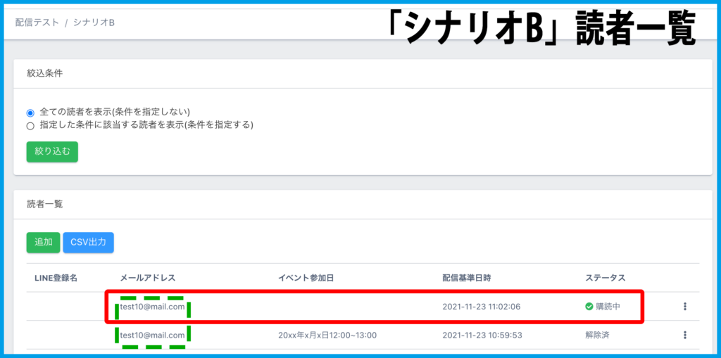 アクションを設定したメール送信後に、メール送信先の読者全員、自動で指定シナリオに追加登録されます。