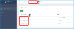 1.上メニュー【メール・LINE配信】>「アカウント一覧」より、利用するアカウントを選択します。
