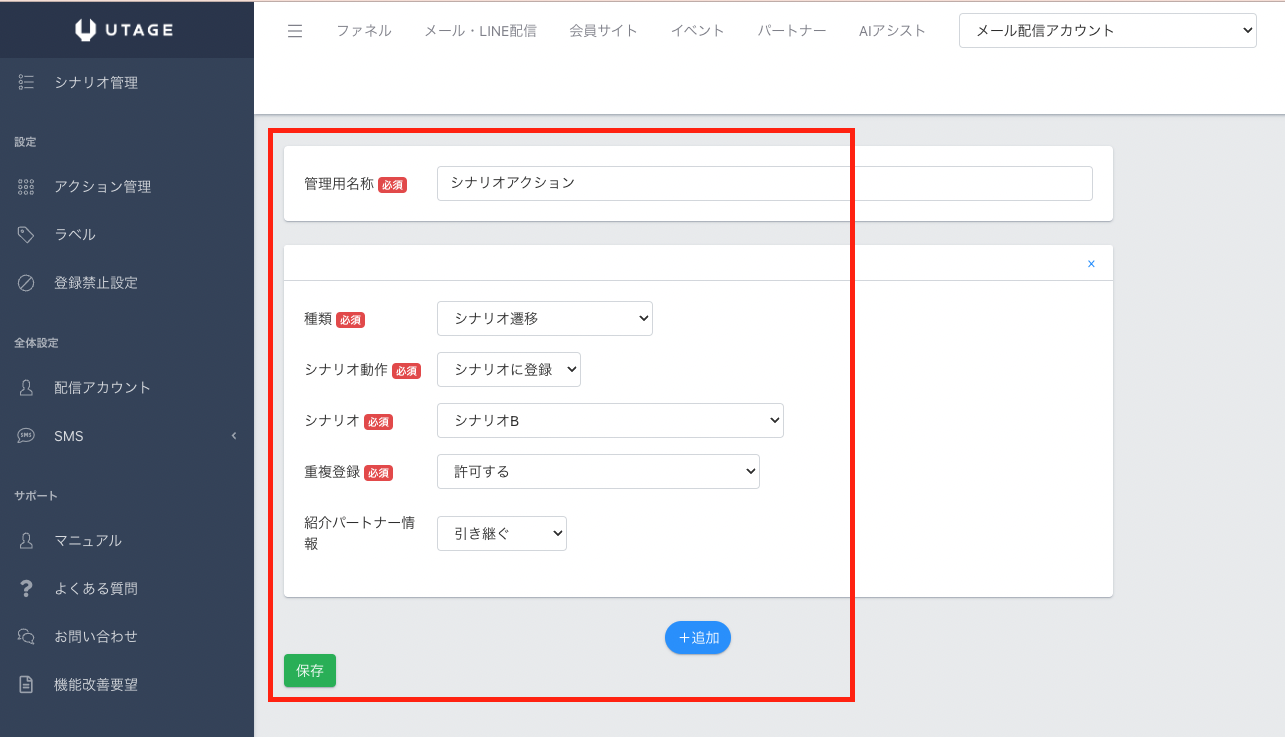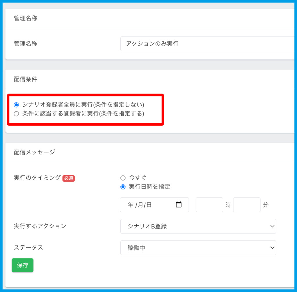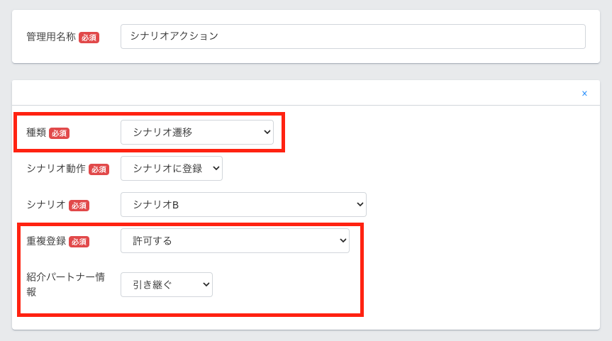 ・シナリオ動作:「シナリオに登録」「シナリオを停止」から選択します。