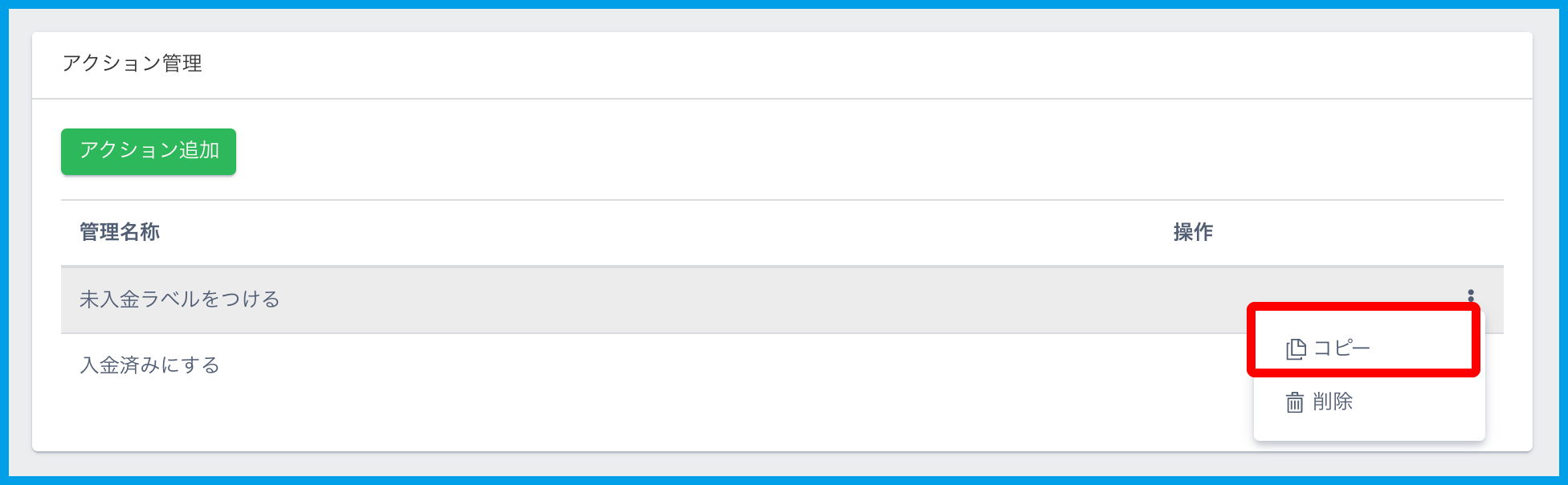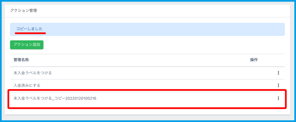 1.コピーしたいアクションの「⋮」メニューから【コピー】をクリックします。