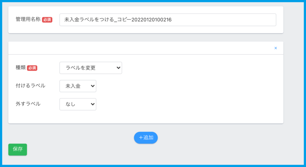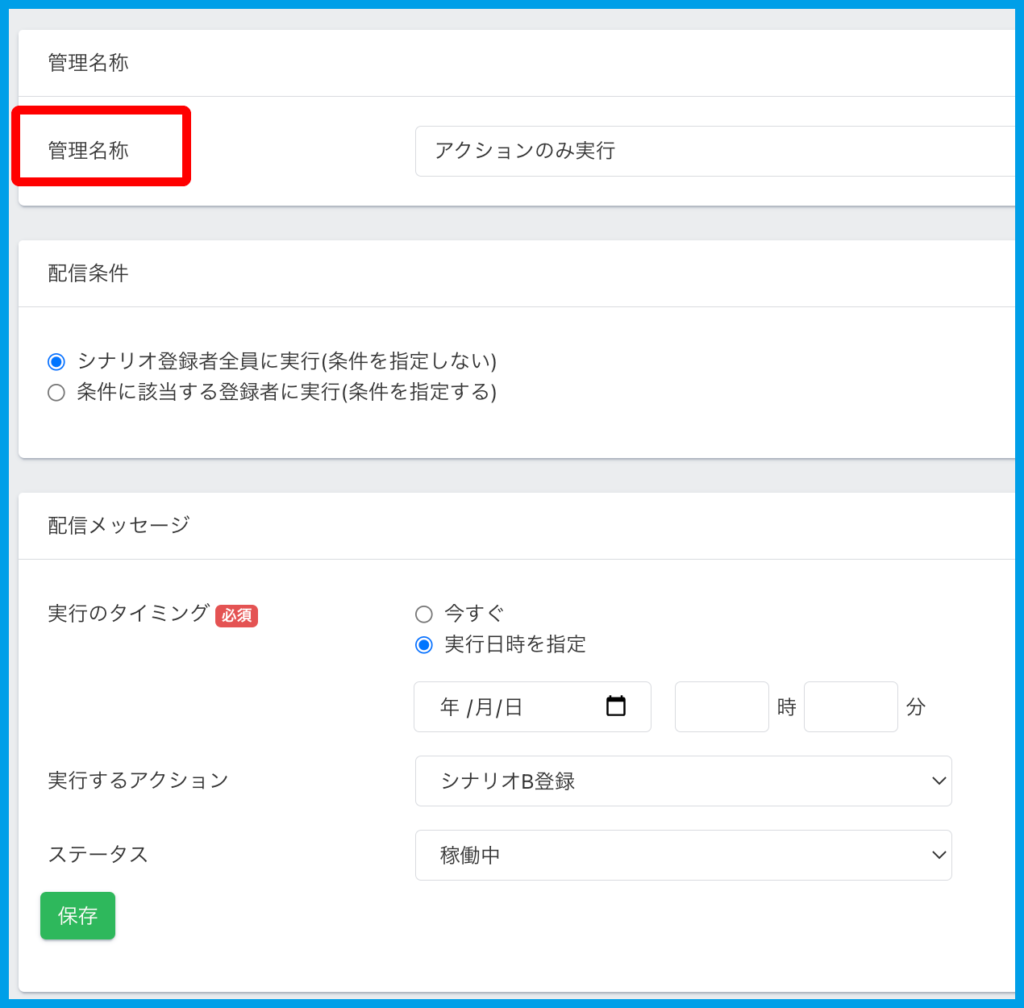 3.アクション名やアクション内容を入力・設定し【保存】をクリックします。