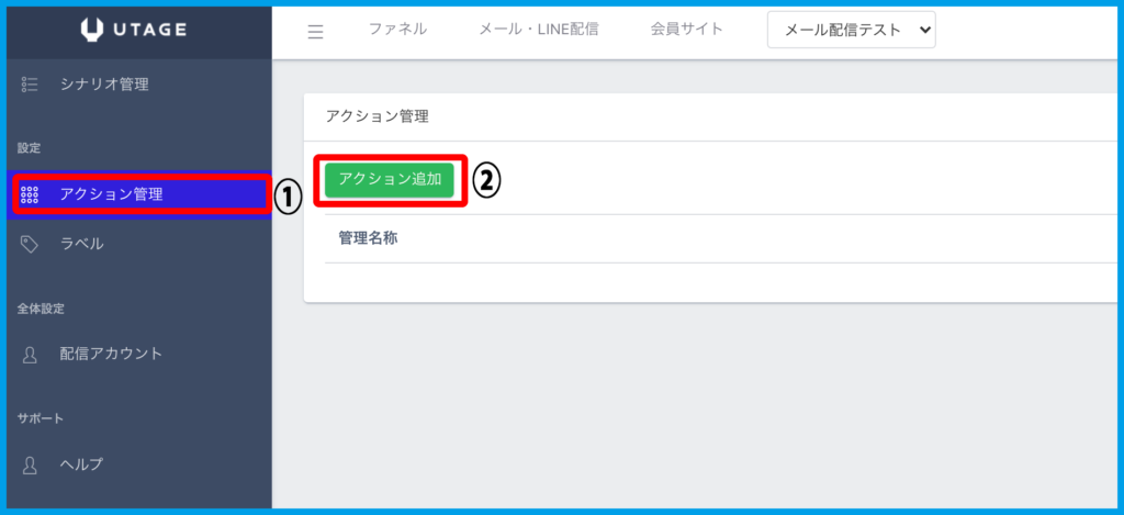 2.左メニュー【アクション管理】を開き【アクション追加】をクリックします。