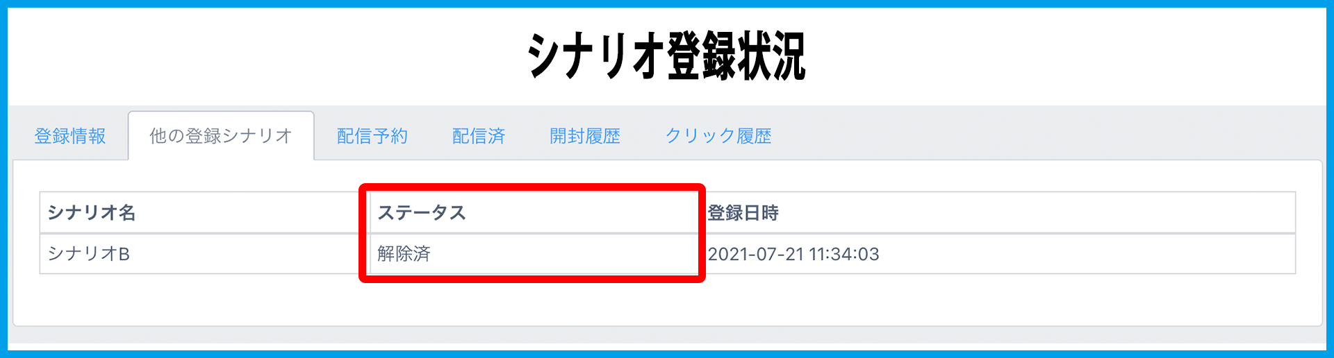 指定したシナリオ先で「解除済」になっているアドレスの場合は、過去に登録されたことがあっても再登録がされる設定になります。
