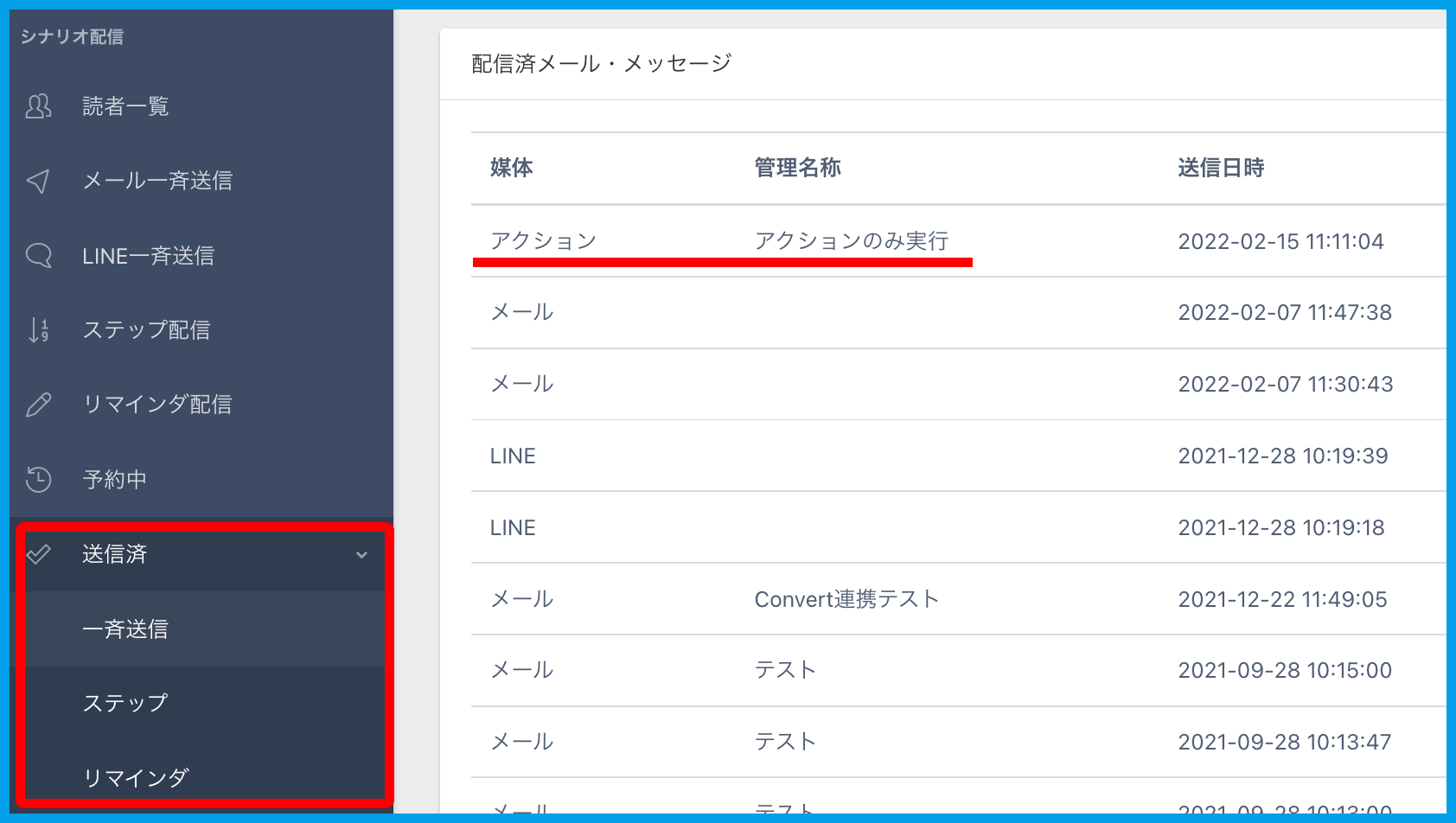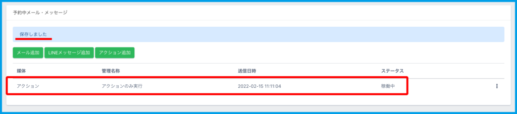 ※「予約中」より設定したアクションは【一斉送信】に記載されます。