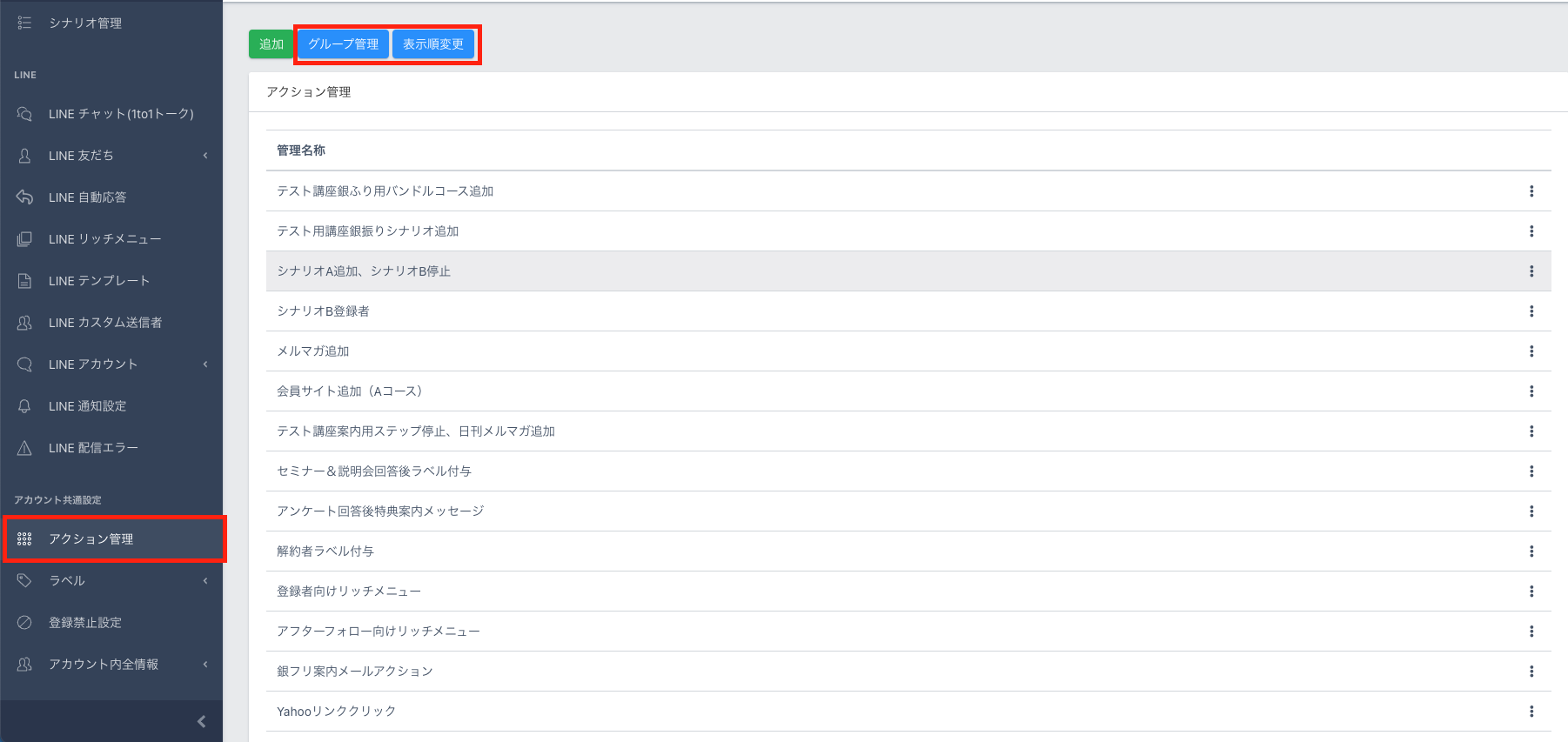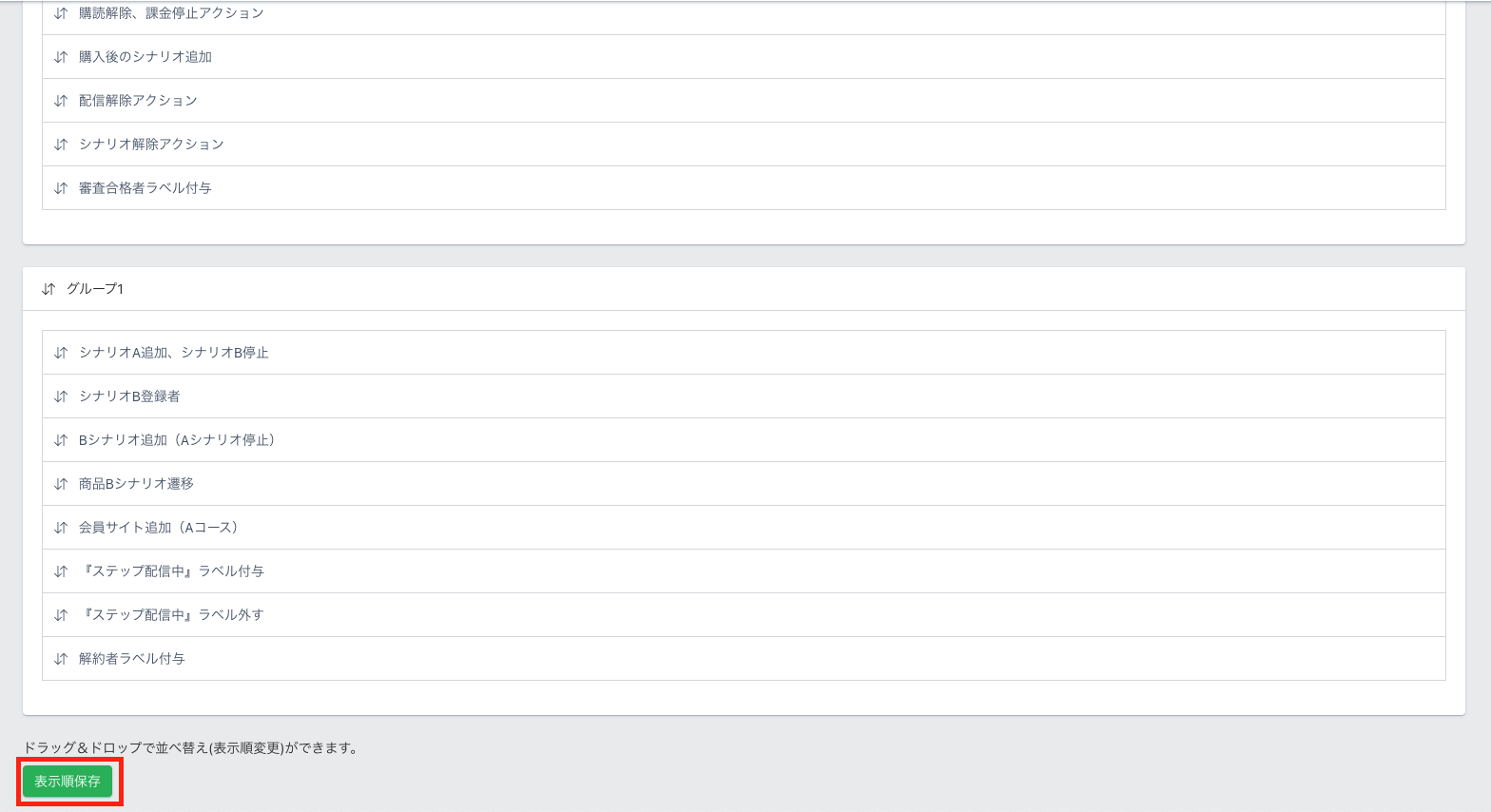 作成したシナリオアクションを管理するために、グループ分けや表示順を変更できます。