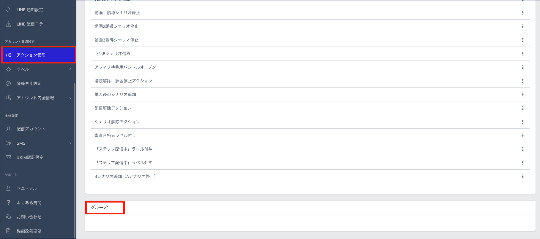 アクション管理に戻ると、作成したグループが表示されます。