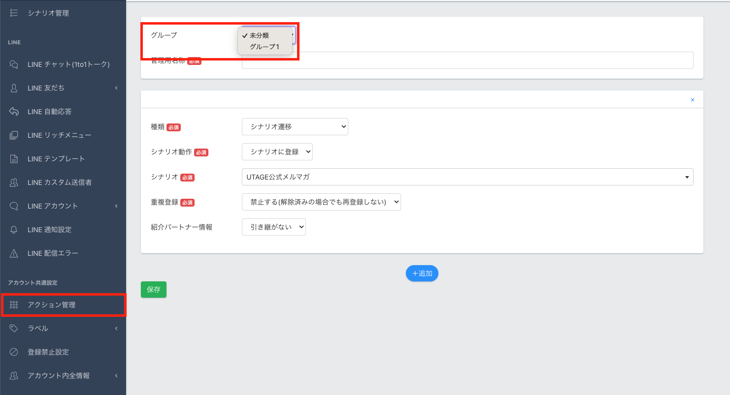 アクション管理>【グループ管理】>【グループ追加】をクリックします。