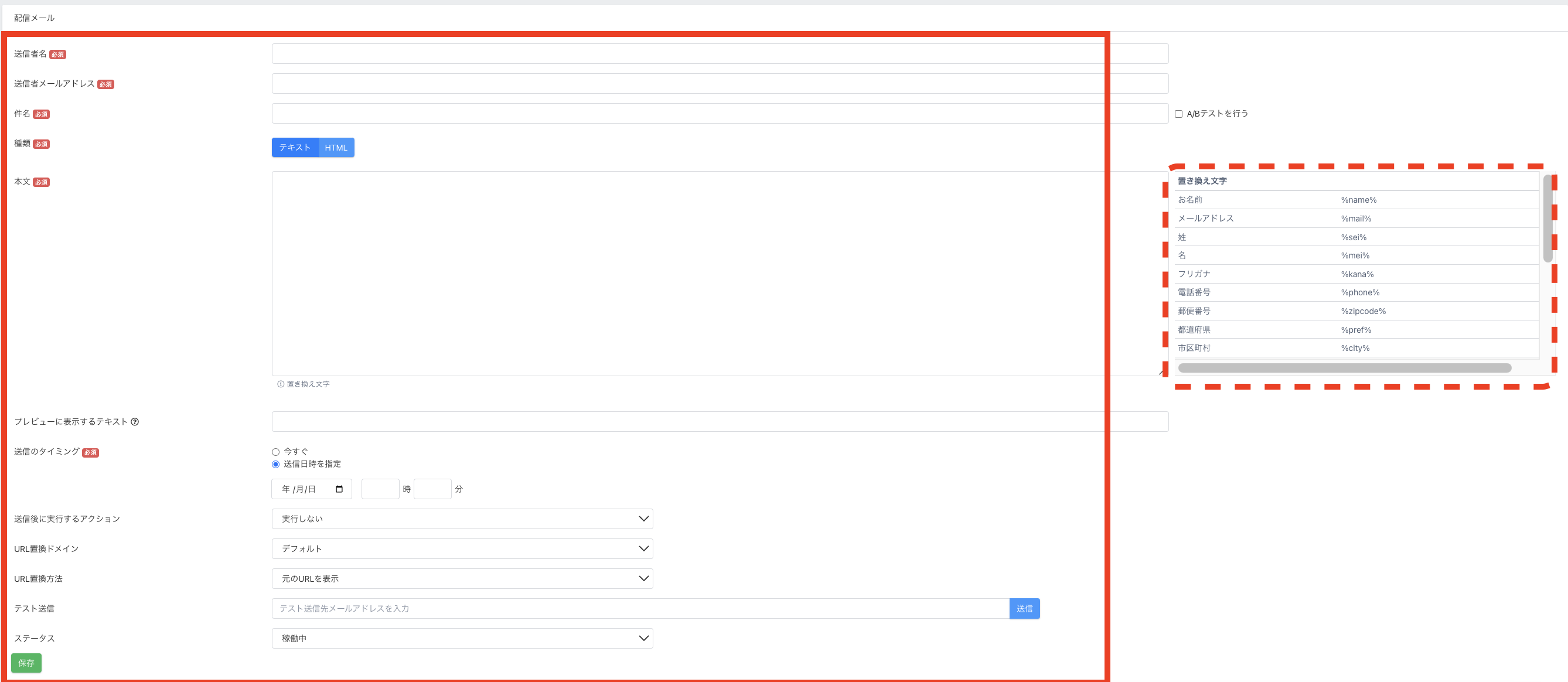 ※本文ボックスの右にある【置き換え文字】一覧をクリックすると、その置き換え文字を挿入できます。設定できる置き換え文字の詳細はコチラ。