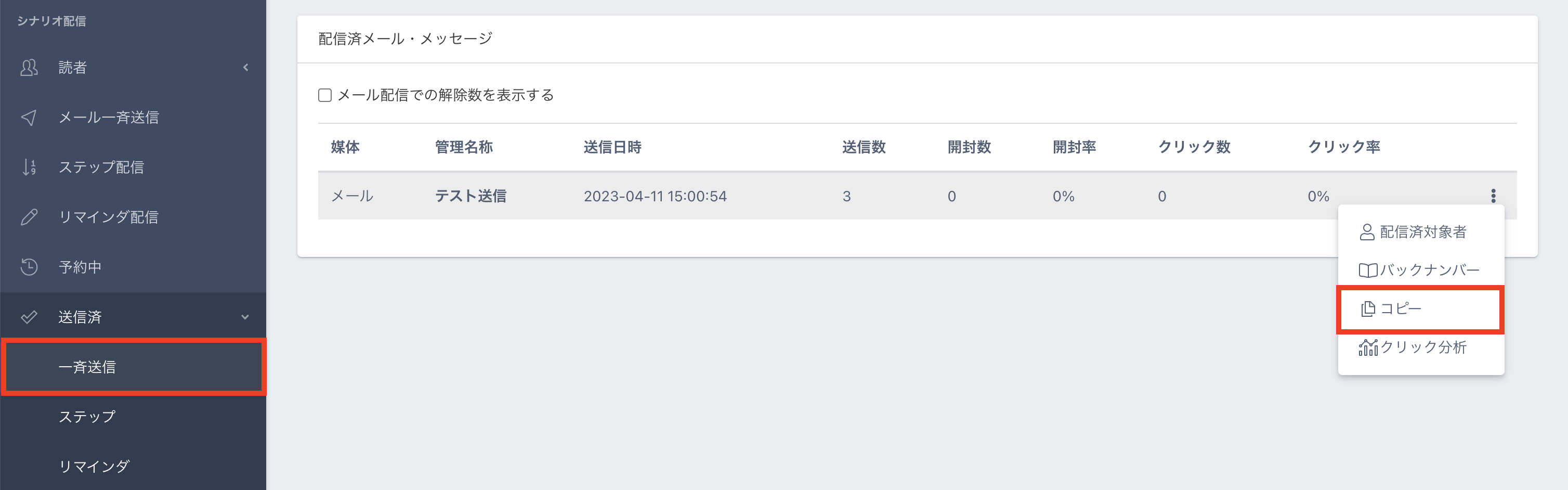6.送信後は左メニュー【送信済】>【一斉送信】に履歴が残り、開封率・クリック率などの確認ができます。