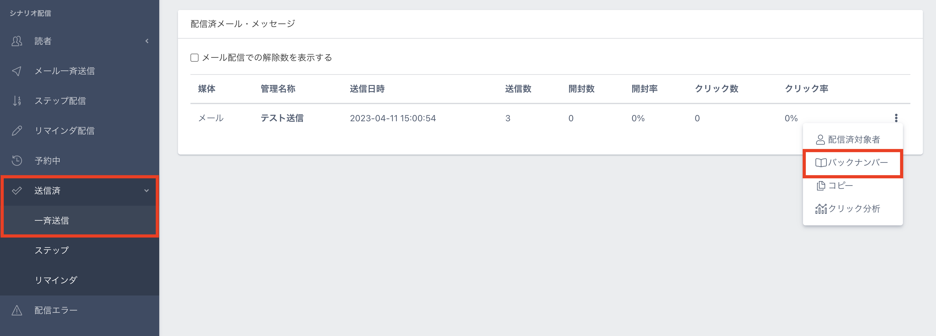 1.【送信済】>一斉送信 より、バックナンバーとて送りたいメールの「⋮」のメニューから【バックナンバー】をクリックします。