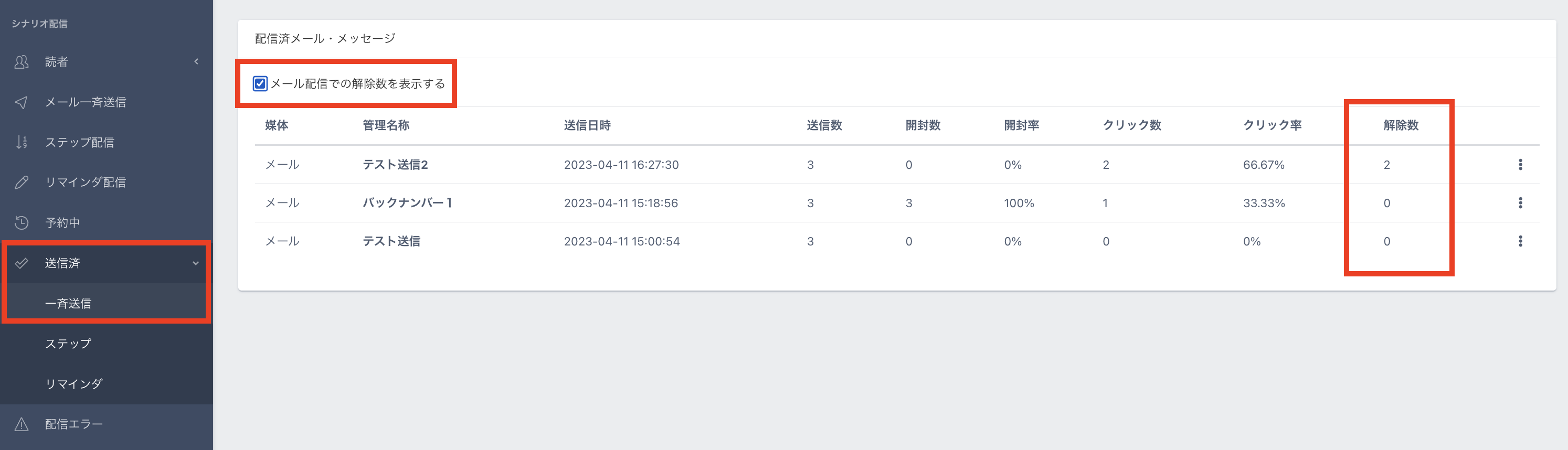 【送信済】>一斉送信 より、【メール配信での解除数を表示する】にチェックを入れると解除数が表示されます。