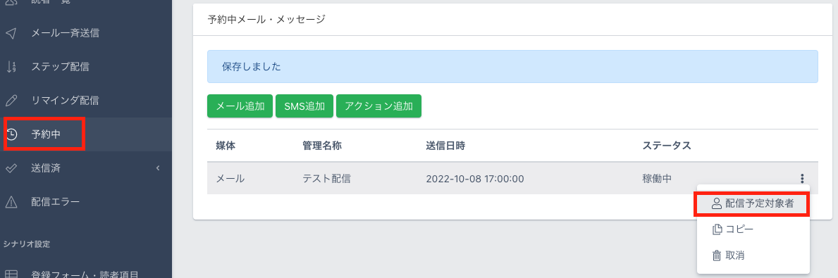 該当の予約済みメールの三点ボタンをクリックして「配信予定対象者」を選択すると参照できます。