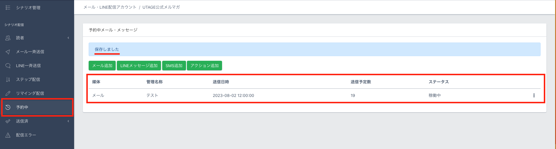 5.【予約中】に設定したメールが表示されます。『媒体』『管理名称』『送信日時』『送信予定数』『ステータス』が確認できます。