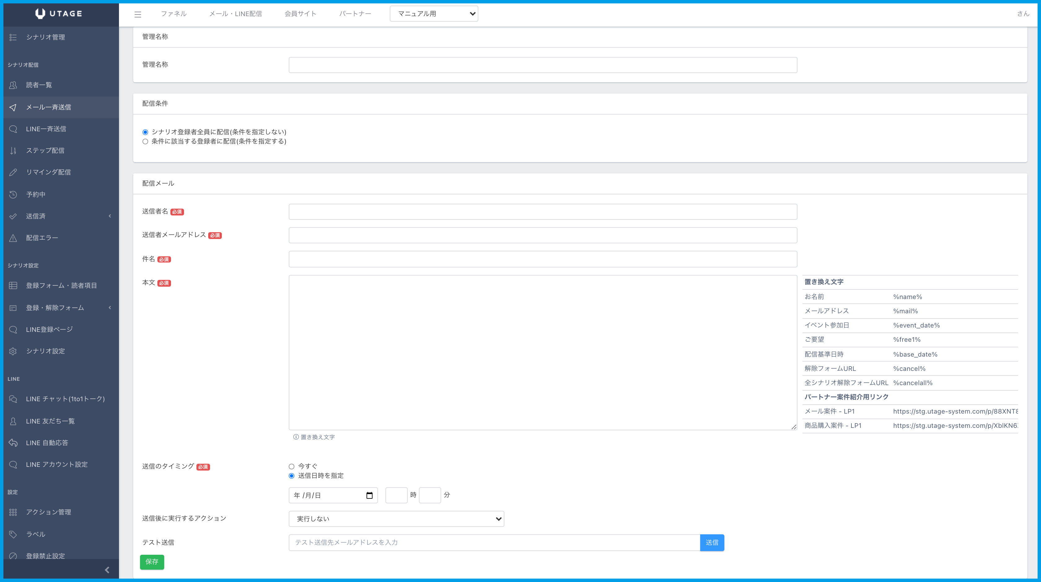 ・送信のタイミング:「今すぐ」「送信日時を指定」より設定できます。