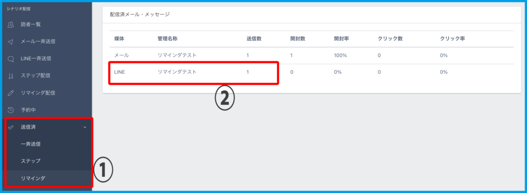 5.送信後は左メニュー【送信済】>【リマインダ】に履歴が残ります。
