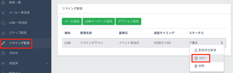 1.【リマインダ配信】より、コピーしたいLINEメッセージの「⋮」のメニューから【コピー】をクリックします。