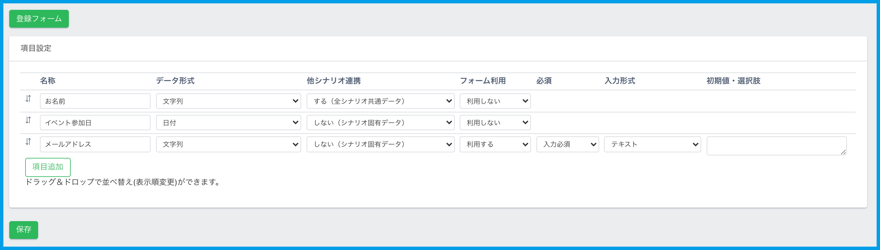 ※「全」シナリオ共有ですので、1つのシナリオで項目情報を更新すると、他のシナリオにも反映される設定となります。