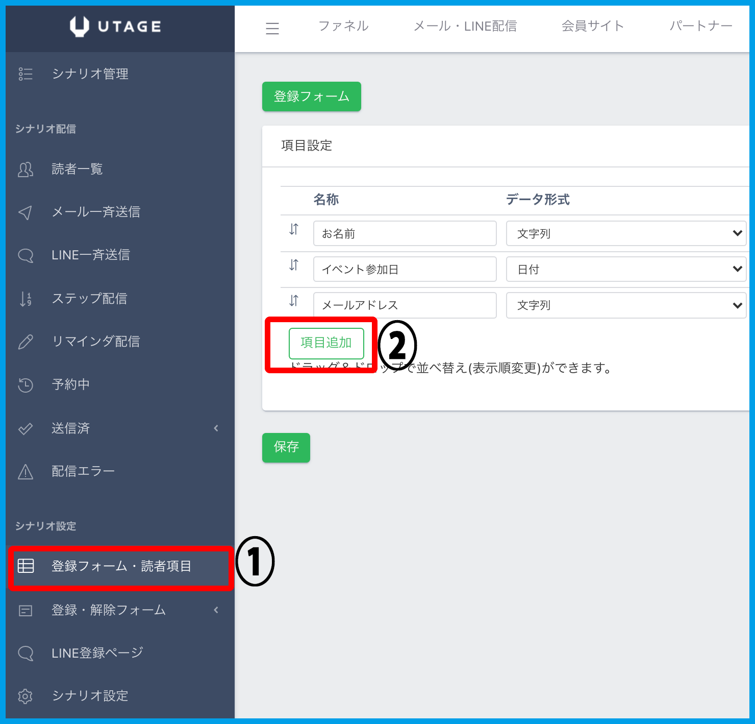 2.左メニュー【登録フォーム・読者項目】を開き【項目追加】をクリックします。