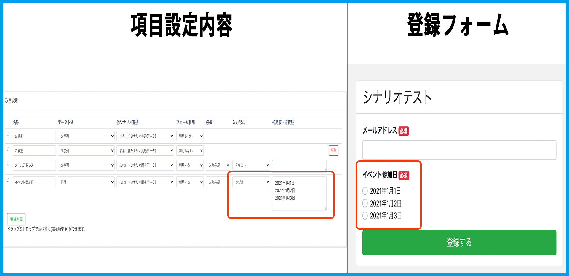 ラジオ:「初期値・選択肢」に日時などを設定しておくと、ラジオボタンで選択できるようになります。