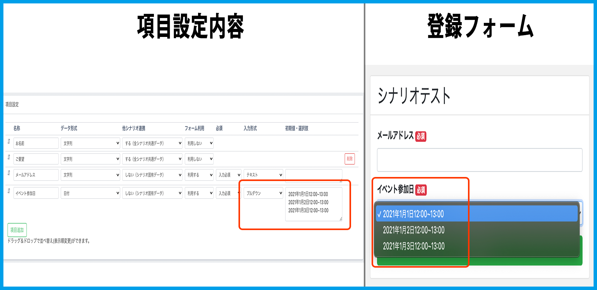 プルダウン:「初期値・選択肢」に日時などを設定しておくと、プルダウン表示され選択できるようになります。