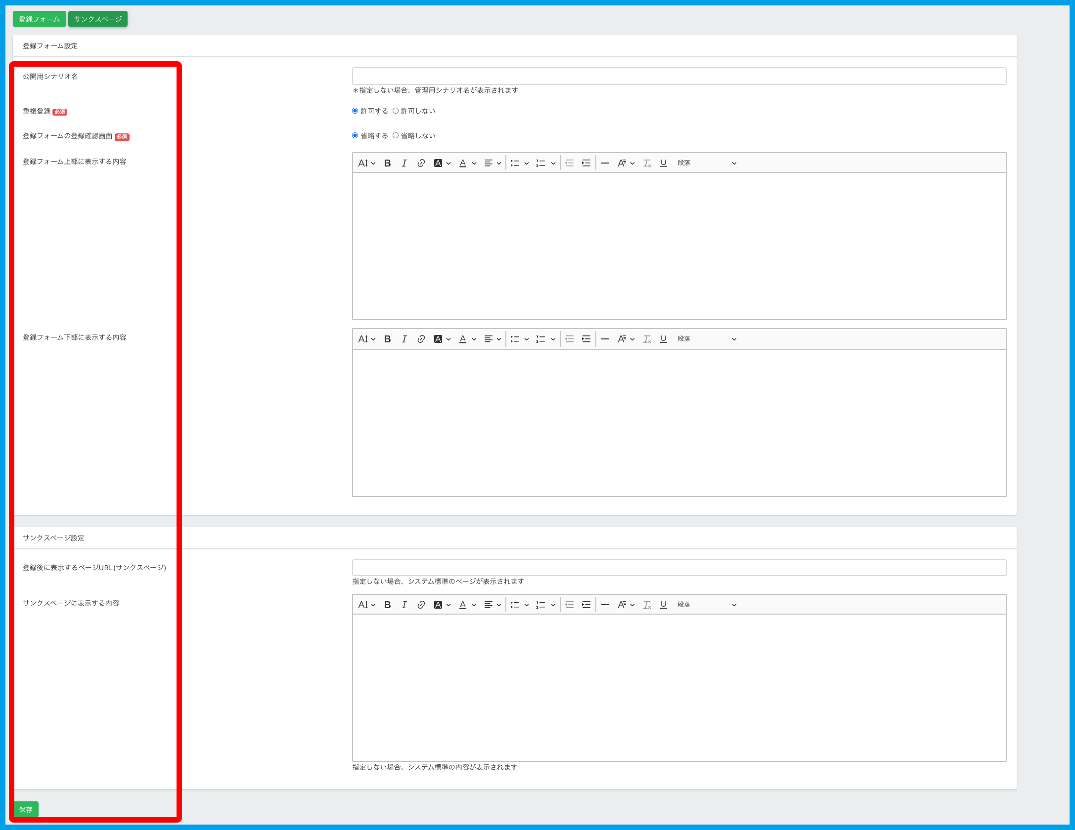 ・登録フォーム下部に表示する内容:登録フォーム下部に表示する内容を入力できます。