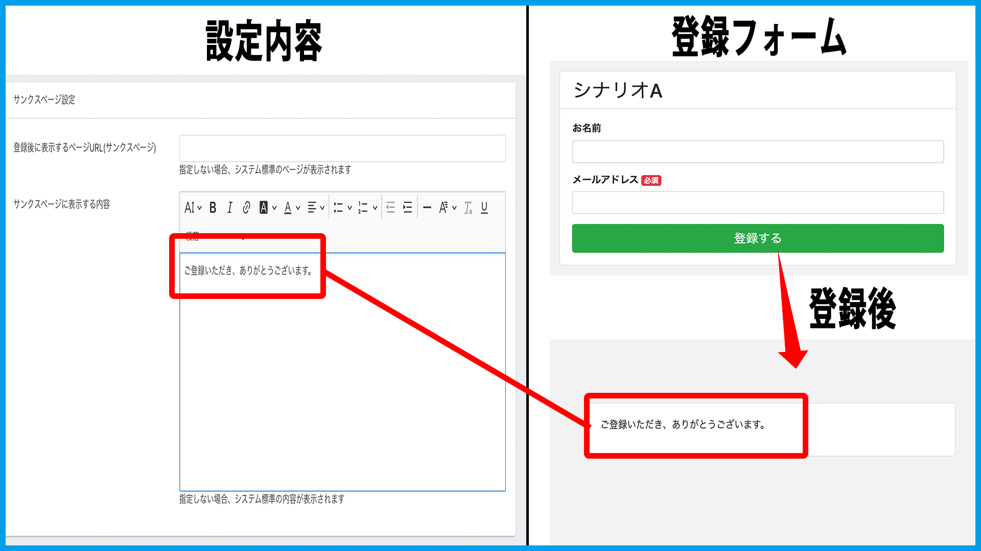 ・サンクスページに表示する内容:サンクスページ内容をここで編集することができます。