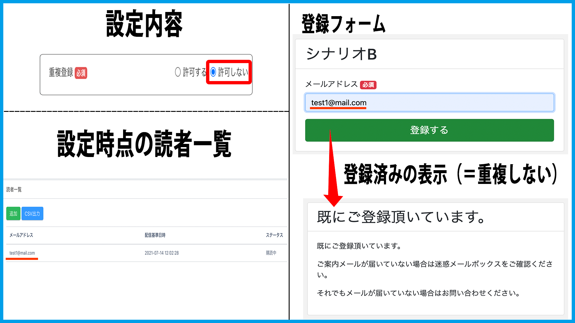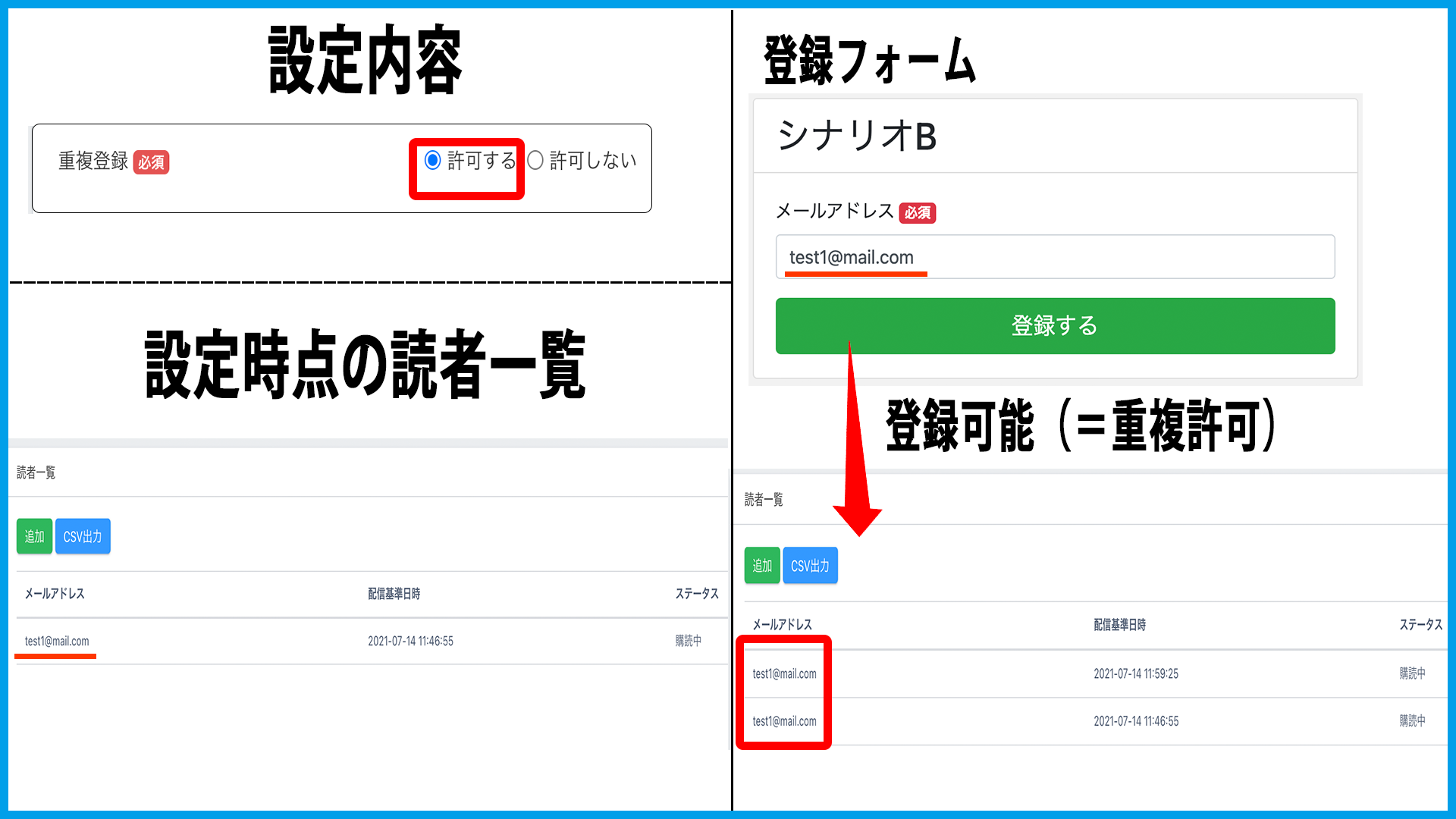 「許可する」場合、読者の重複登録が可能になります。