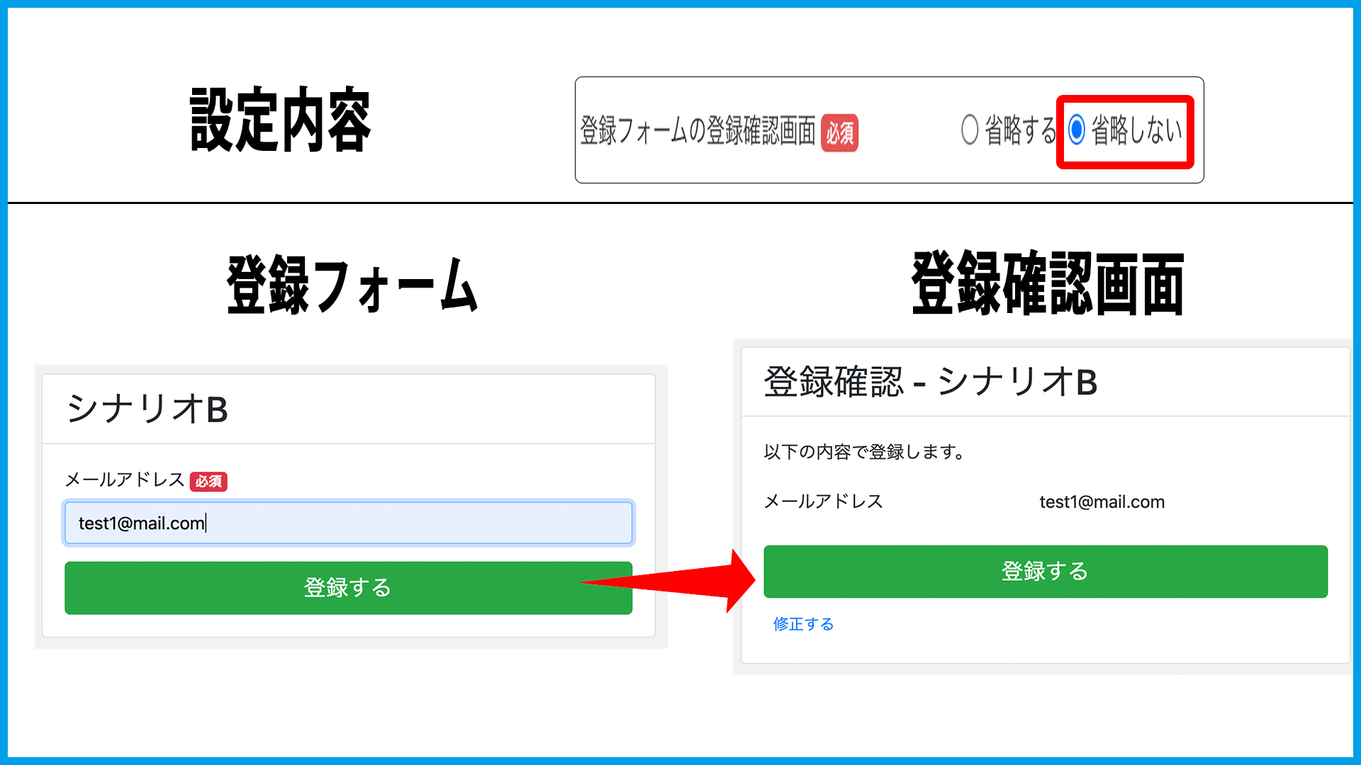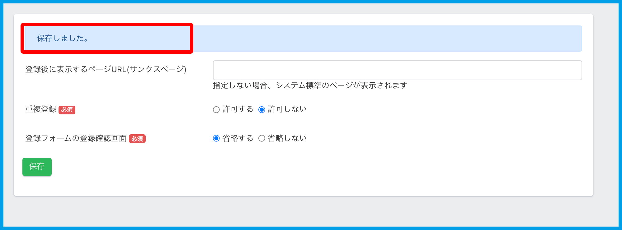 ・登録フォームの登録確認画面(必須):「省略する」「省略しない」より選択できます。